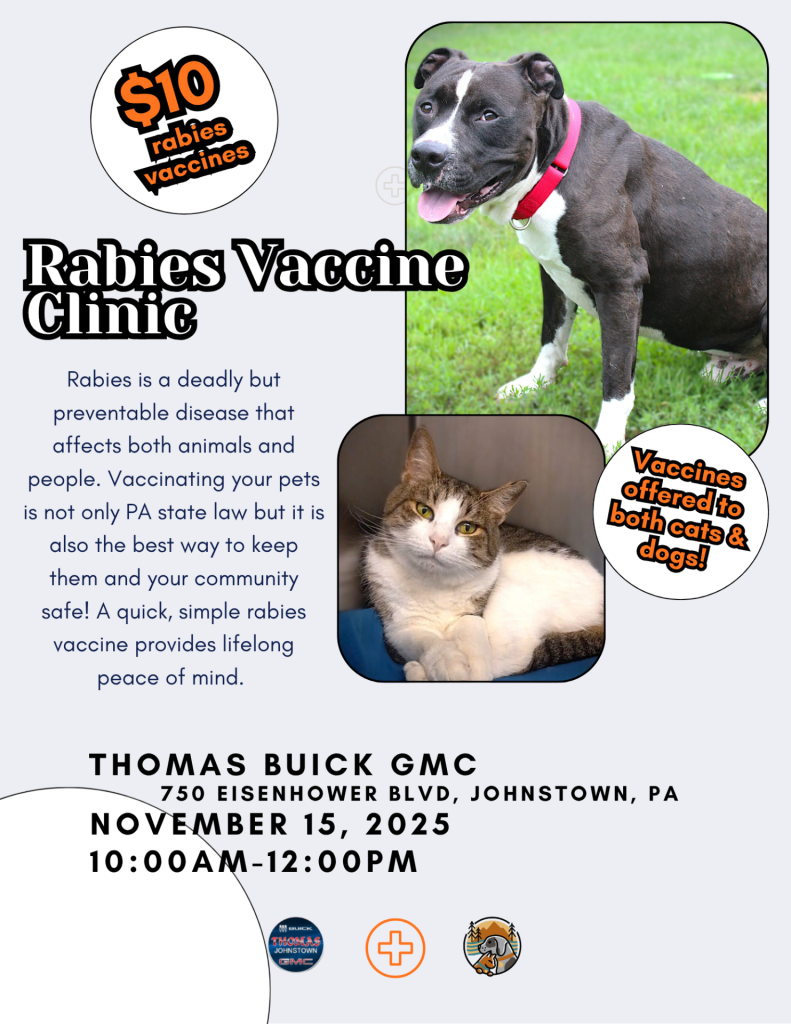 Join us at Thomas Buick GMC on Saturday, November 15th, from 10 AM to 12 PM for a special rabies vaccine clinic for your furry friends!
